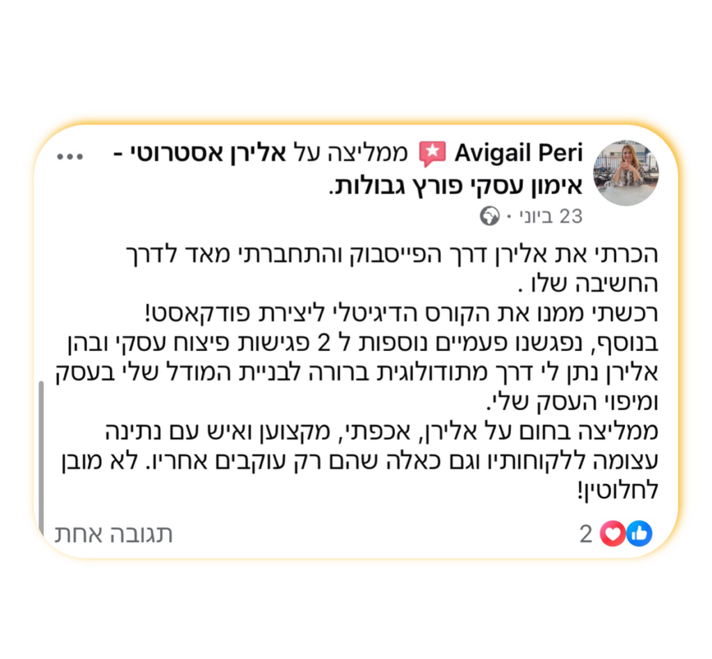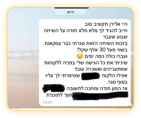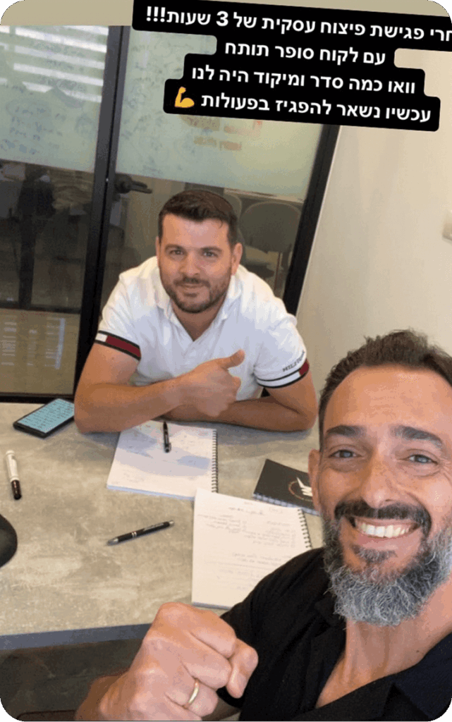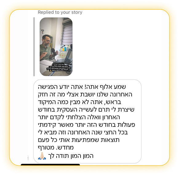 תחשוב רגע כמה עולה לך בלבול. כמה שווה חודש של תקיעות, של עבודה בלי כיוון. וכמה מעט עולה לעצור פעם אחת, לקבל בהירות ולצאת לדרך עם תכנית שמחזירה שליטה.