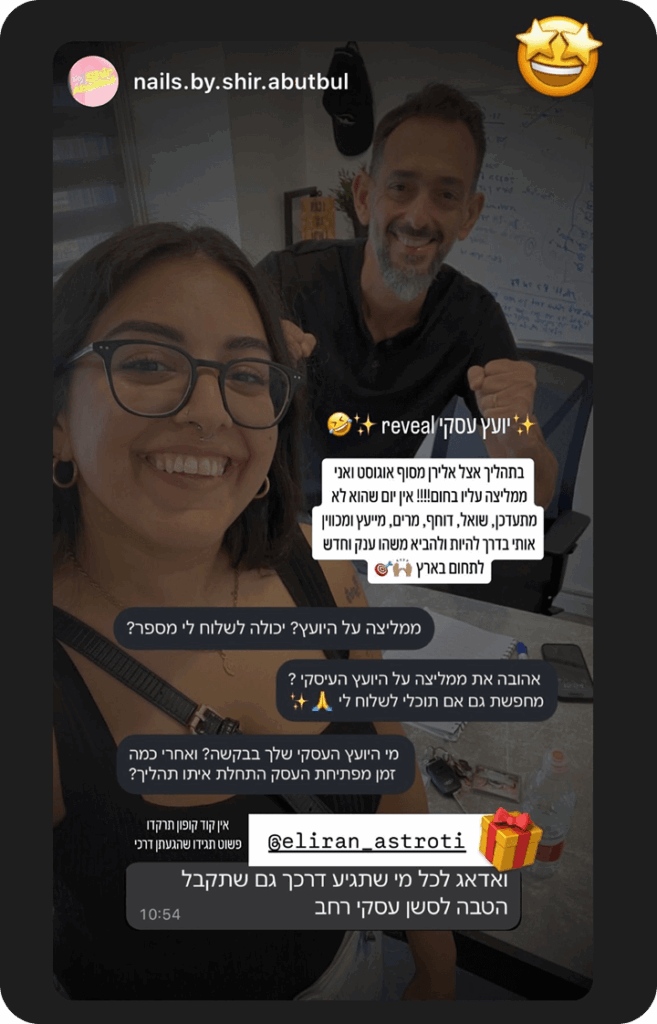 מאמן עסקי בן 41 נשוי באושר לאלמוג ואבא שרוף של אריאל ליאם ומיבל הקטנה, ובשנים האחרונות ליוויתי מאות מאמנים, מטפלים ויועצים שרצו דבר אחד פשוט – להפסיק להרגיש תקועים, ולהחזיר לעצמם את האש והביטחון בעסק.