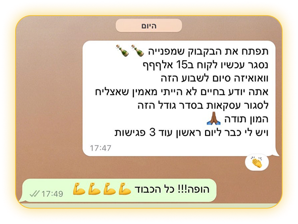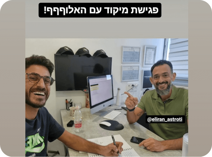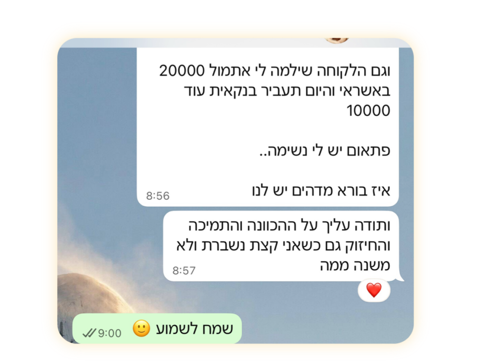 אם ממש תרגיש שאתה רוצה לצעוד קדימה אבל כן צריך דחיפה חזקה נוספת ליישום ולדיוק, נוכל לבחון תהליך ליווי ביחד.
