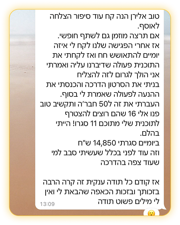 למי שמוכן לעבור לשלב הבא: להגדיל את ההשפעה, את הרווח, ואת הביטחון בעצמו ובדרך שלו.