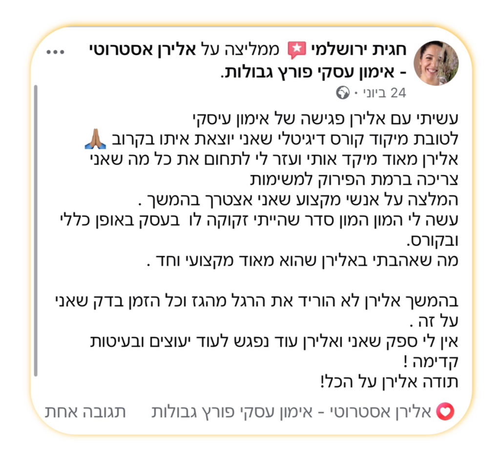 הסשן יעזור לך להימנע מטעויות יקרות ולהקים את העסק על בסיס בריא, ברור ונכון.